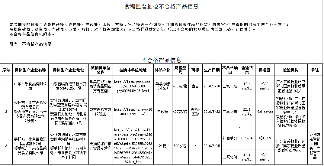(三)标称北京古松经贸有限公司委托河北古松农副产品有限公司分装、由古松官方旗舰店在京东(网站)销售的白砂糖,二氧化硫检出值为22.7mg/kg。比标准规定(不超过6mg/kg)高2.8倍。初检机构为广州甘蔗糖业研究所(国家糖业质量监督检验中心)、复检机构为河北出入境检验检疫局检验检疫技术中心。