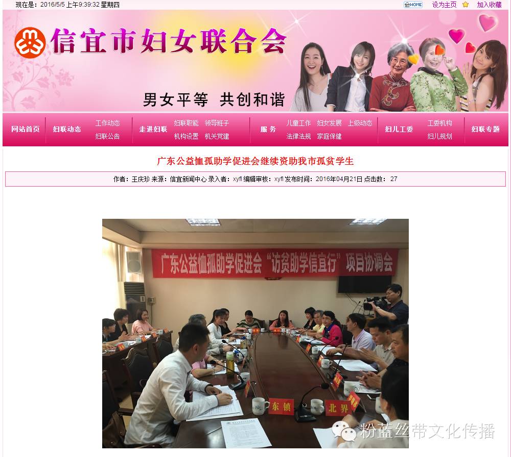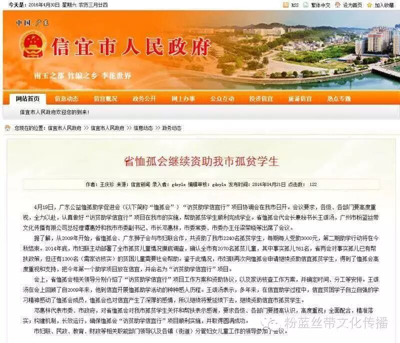 广东公益恤孤助学促进会“访贫助学信宜行”项目协调会在信宜市召开。“春雷行动”在会上进行了阶段工作汇报,汇报了第一、二阶段的工作进程和第三、第四阶段的工作计划。,广州市粉蓝丝带文化传播有限公司总经理谭惠妤和我市市委副书记、市长邓惠林,市委常委、市委办主任梁荣晓等出席了会议。