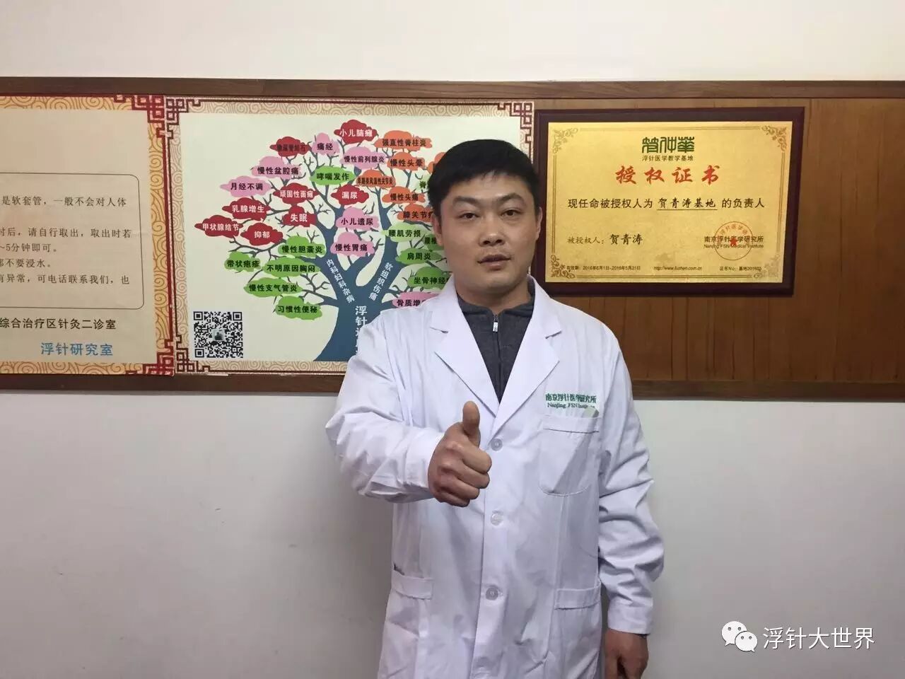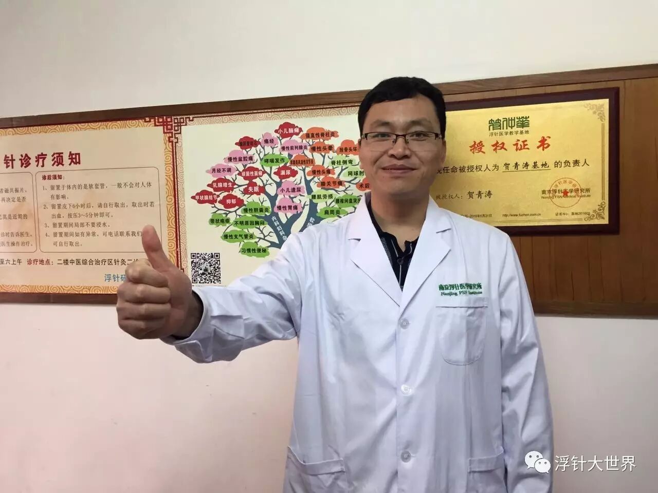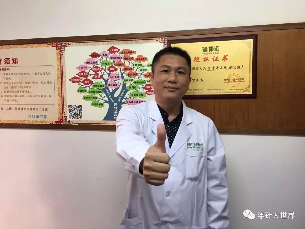 2017年2月22日 ,接到了总部通知 ,说我可以去贺青涛老师基地跟师学习 ,终于等到这一天了,乐的我一晚上没睡着觉。3月5号下午乘飞机来到广州这即熟悉又陌生的城市。 3月6号早上, 看到贺老师治疗的每一个患者痛苦的来 ,开心的走了。 贺老师那一本正经的幽默 ,还有精湛的技术, 让我佩服的都不知道用什么词语来形容。让我印象深刻的是一个颈椎病患者,自述头往左边转时感觉有一根筋拉着,甚至连呼吸都有点困难。曾经给人做过推拿按摩,也做过艾灸,也接受过豪针治疗,都没有缓解症状。在贺老师精心分析和细心查找后,终于找到“敌人”(患肌)了,在肱桡肌做一个远程轰炸,扫散配合再灌注活动后,让患者试试呼吸有没有得到改善,患者一做深呼吸尝试,喜出望外的说“诶真的好多了”患者高兴,我也惊讶,为什么这样一针就改善了他的呼吸呢?接着贺老师又找到第二个敌人“敌人”(患肌)在头夹肌上又打了一针,扫散配合相应的再灌注活动以后让他再活动看看好点没,他活动以后说:诶好多了,就是还有一点点牵拉感,贺老师又在前锯肌那里打了一针,扫散配合再灌注活动以后,让患者再活动试试。患者活动过后惊讶的说:啊!这下真的好了,没有牵拉感了,还跟贺老师说他也要学浮针。浮针太神奇了。以前我们治疗的患者思路不清晰 ,有的灌注活动不正确, 找不准“敌人”(患肌)只会对着疼痛点乱开枪 ,有的运气好给蒙好了 ,有的时候运气不好,治不好不说还越来越严重了。这次到贺老师基地跟师, 在贺老师的耐心讲解和教导下 ,明确的了解了治疗的思路, 见识了浮针的真正魅力 ,浮针行 ,浮针棒 ,浮针让我们对疼痛治疗有了新希望 。感谢贺老师的耐心指导 !感谢符老师的伟大发明 !