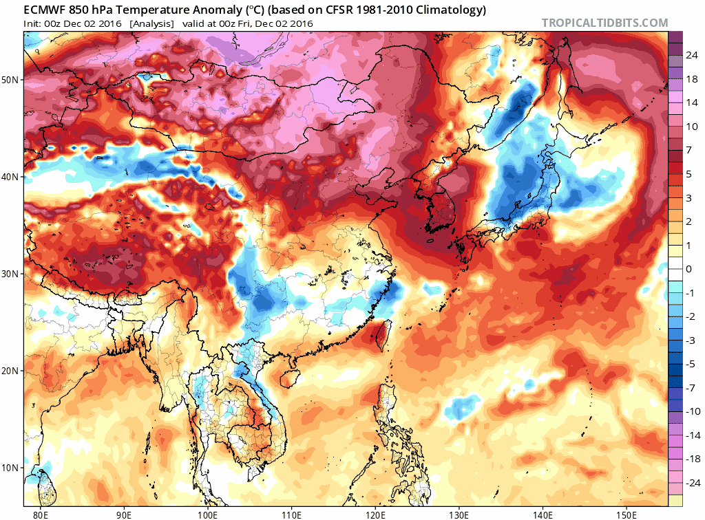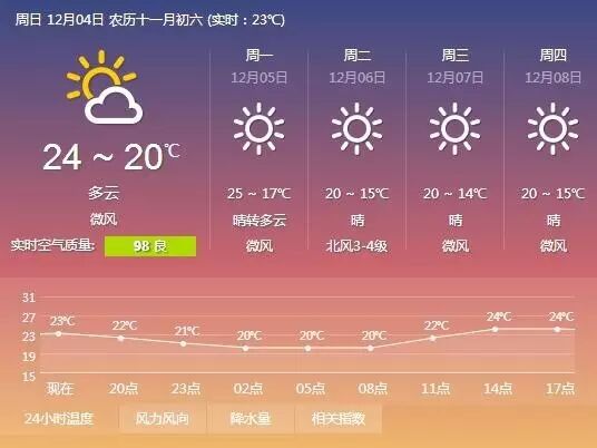 12月5号之前,局势不变,大回暖、大雾霾当然也会变本加厉。我就说几个数据:福州、广州可能要涨到25度附近,沪宁杭涨到20度附近;但京津冀连带山东河南陕西也要连霾两天,且很多地方可能爆表。