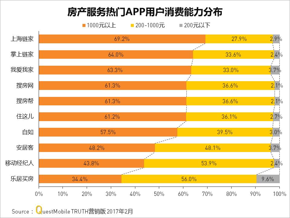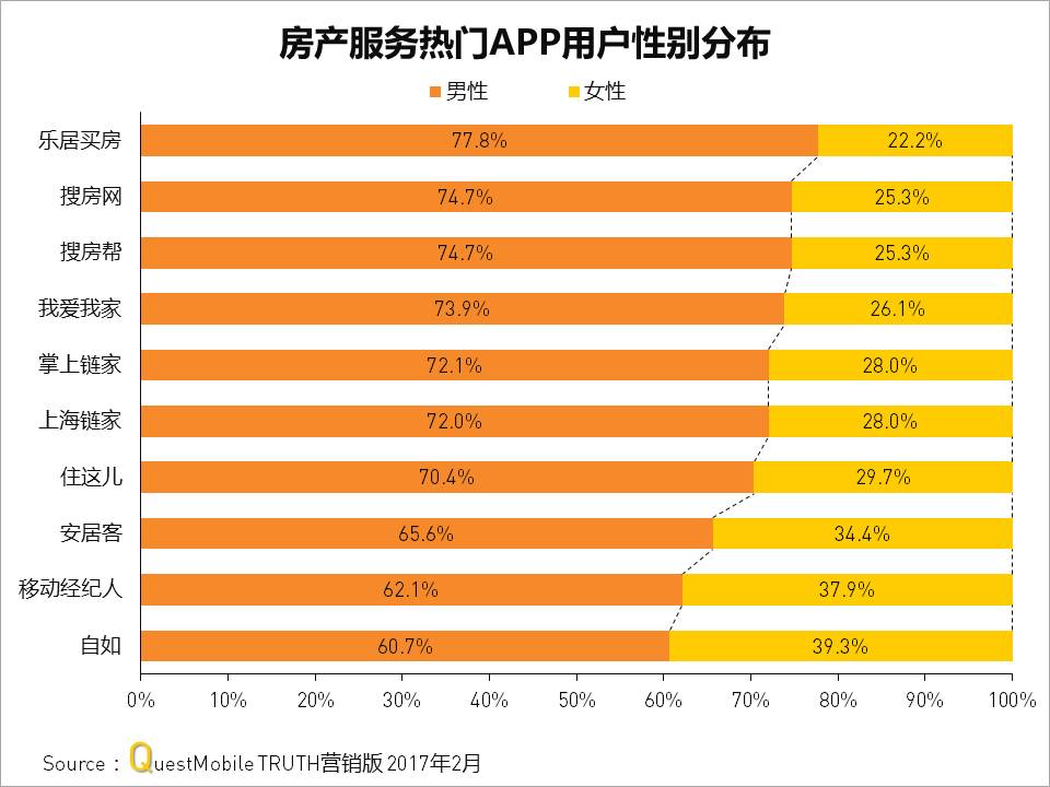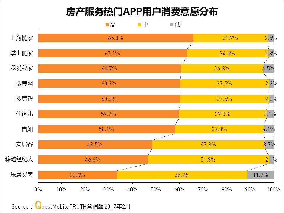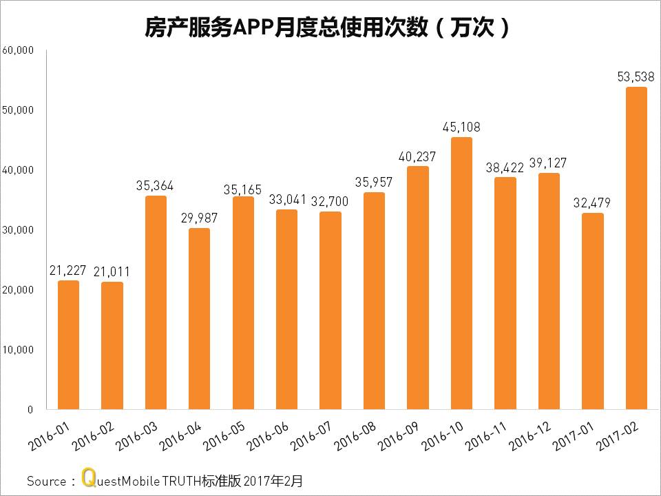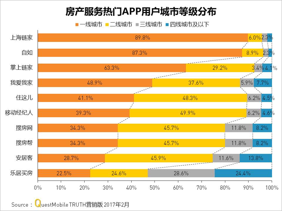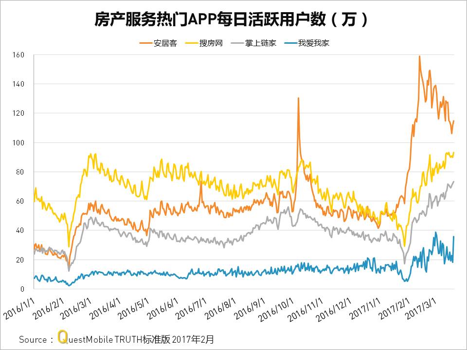 QuestMobile数据显示,从2016年2月到2017年2月,安居客与搜房网互有高低,基本上维持一二位,掌上链家,这个是此前Mr.QM介绍过的,从线下杀到线上的“实力派”,加上前几年线下与线上的几次狙击战,市场格局颇值得玩味。