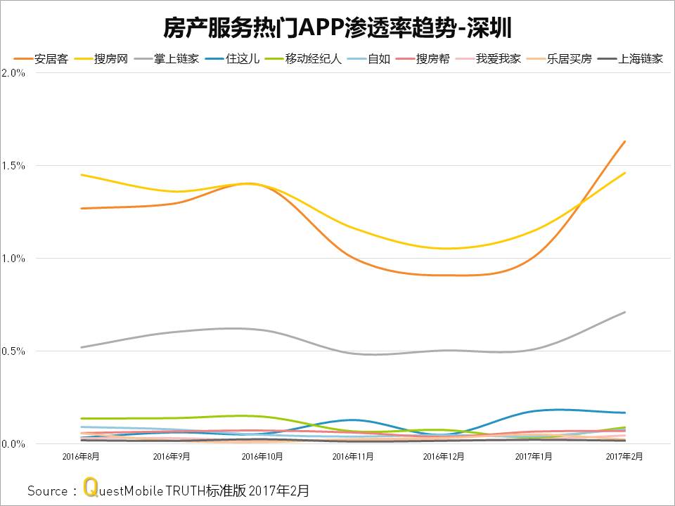 QuestMobile数据显示,上海链家在上海渗透率最高,也是唯一一个超过2%的APP。在北京,掌上链家则基本维持了同等位置。深圳和广州,相对而言实力表较均衡,安居客和搜房网均在1%到1.5%之间,捉对厮杀。