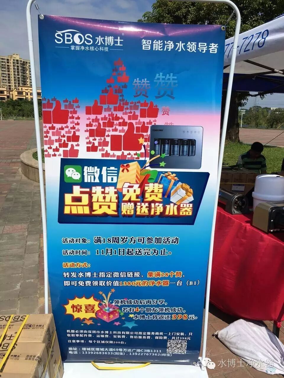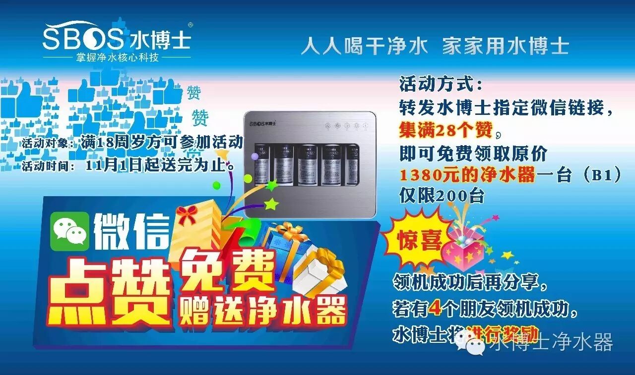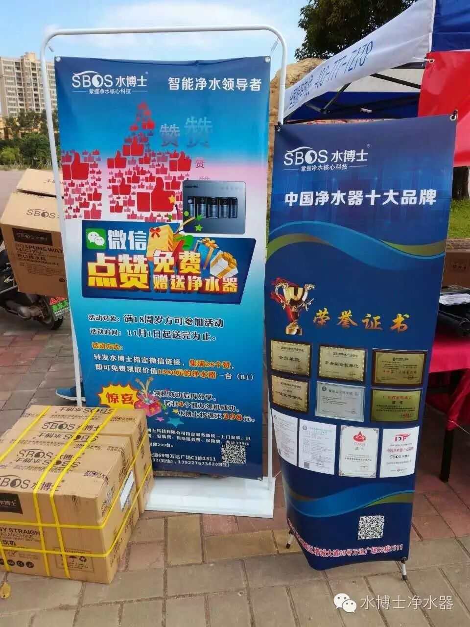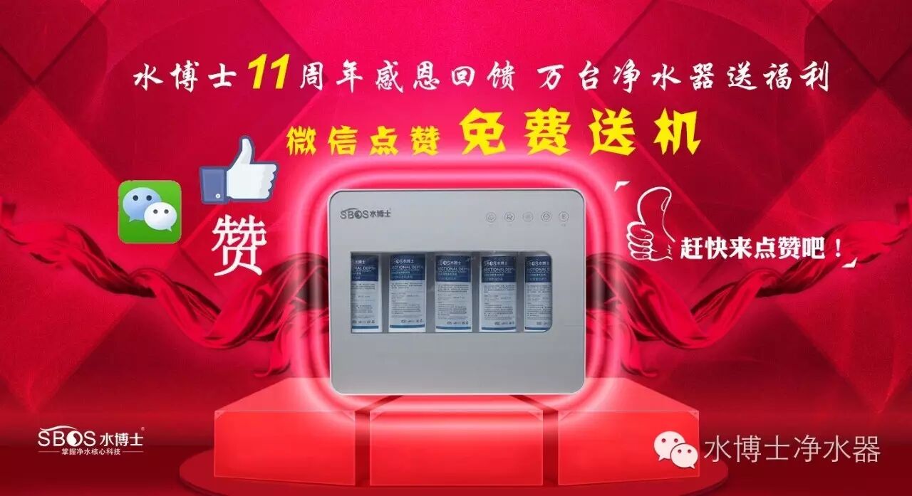 在水博士创立11载之际,正逢今年的双十一,水博士推出全国大型活动“庆祝水博士11周年,万台净水器免费送”。各地在水博士总部的号召下纷纷举办“398微信点赞免费送机”活动!本活动主要以各地代理商为中心,以发散式吸引广大消费者参与!目前,广州增城、云南昆明、广东肇庆等区域率先开拔,活动已经进入白热化!