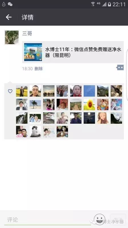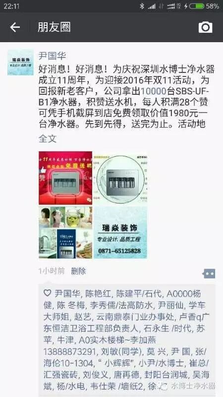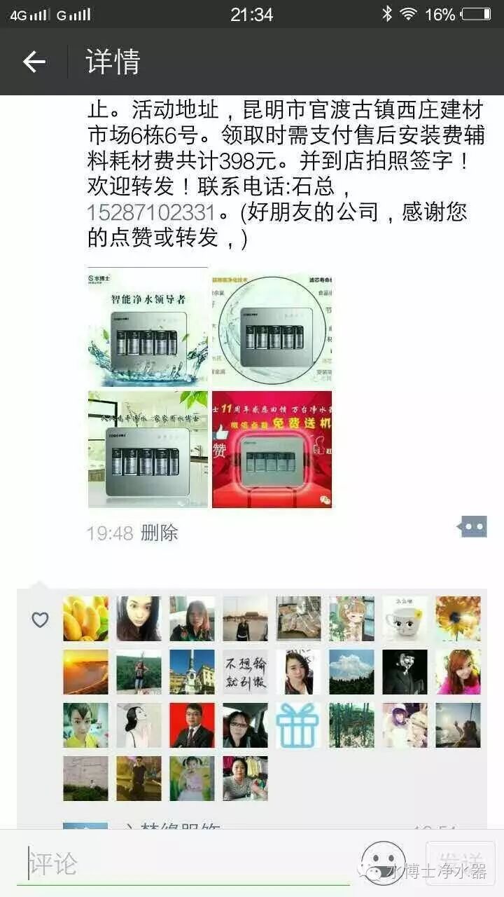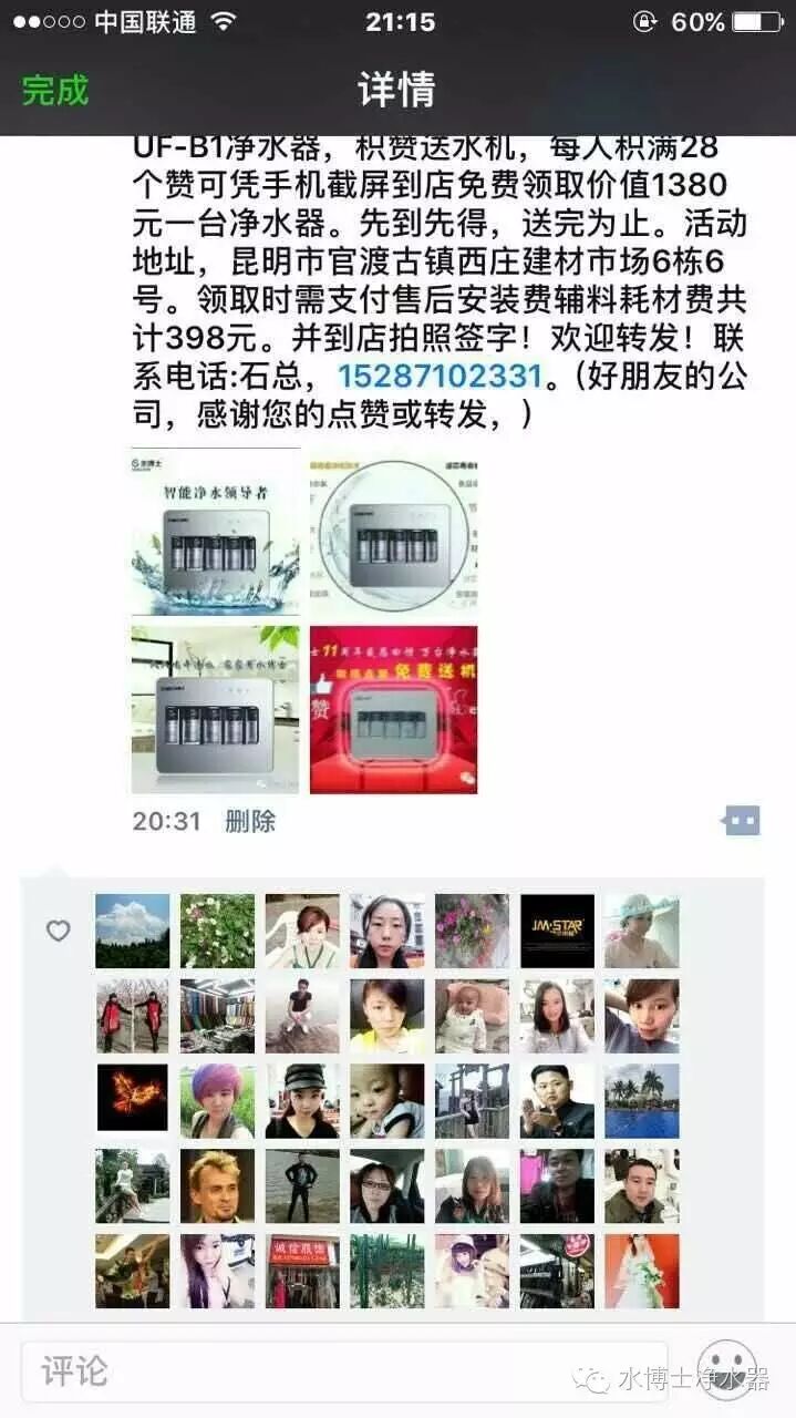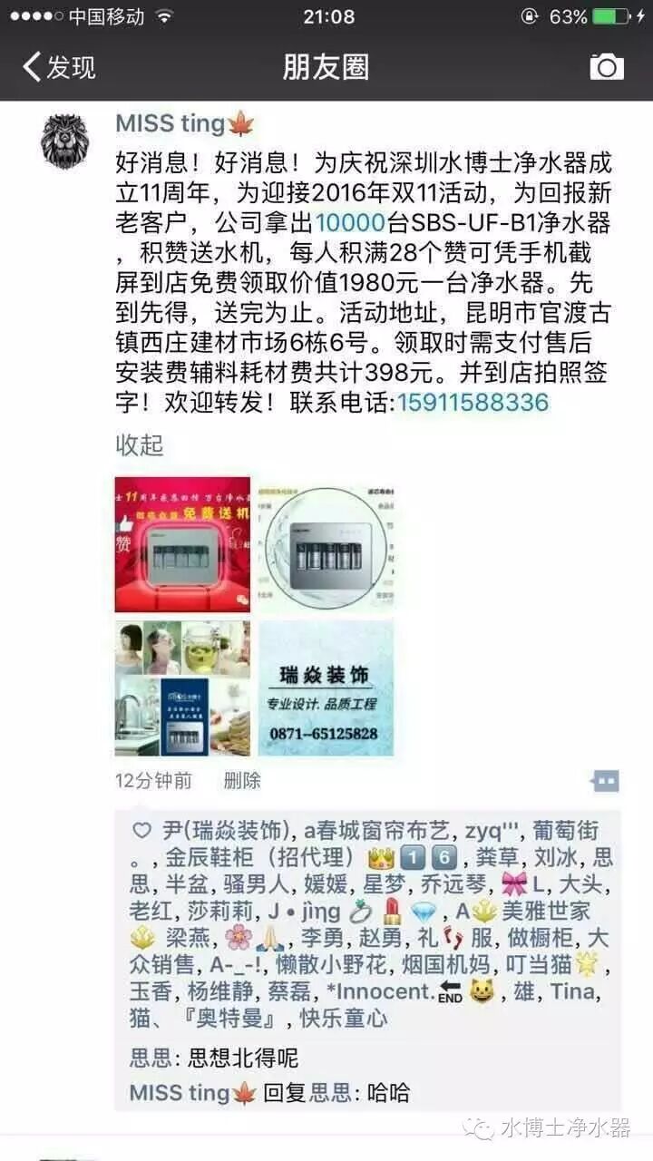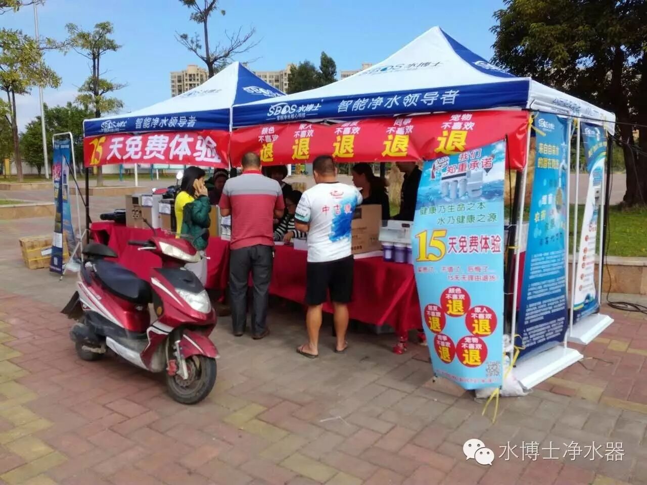 在水博士创立11载之际,正逢今年的双十一,水博士推出全国大型活动“庆祝水博士11周年,万台净水器免费送”。各地在水博士总部的号召下纷纷举办“398微信点赞免费送机”活动!本活动主要以各地代理商为中心,以发散式吸引广大消费者参与!目前,广州增城、云南昆明、广东肇庆等区域率先开拔,活动已经进入白热化!