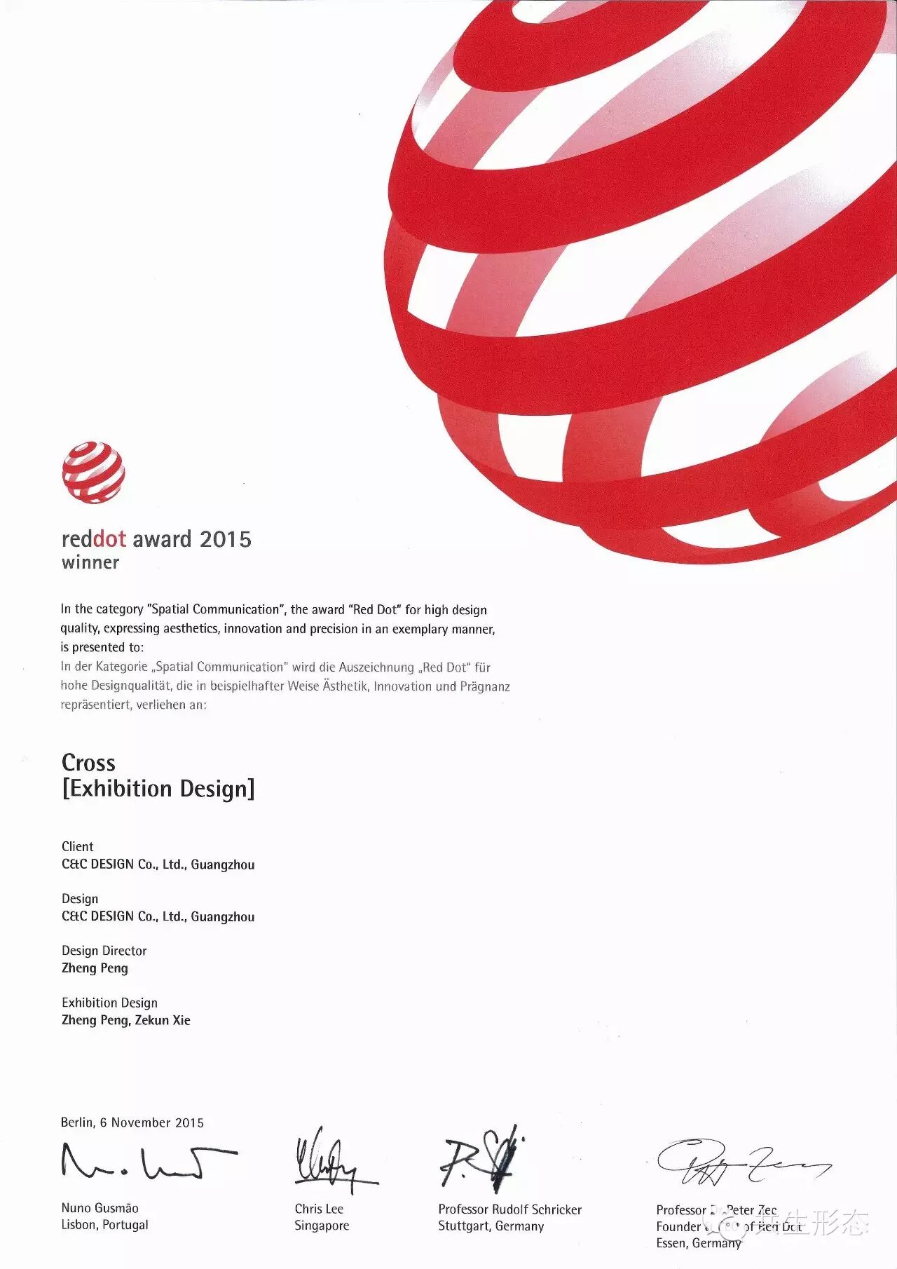 2015年8月10日,德国红点奖 (Red Dot Award) 公布了2015年度获奖名单,在全球多个国家的设计作品中,广州共生形态设计集团作品《CROSS》脱颖而出,最终获得“Red Dot Award:Communication Design 2015” Spatial Communication类别的年度大奖。