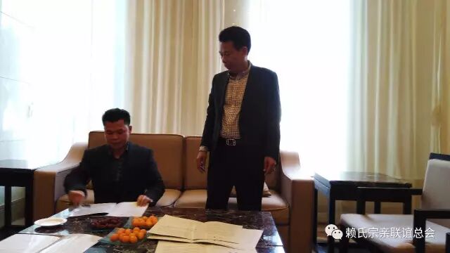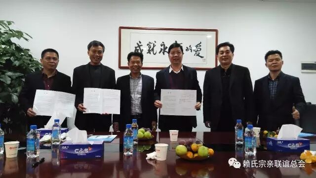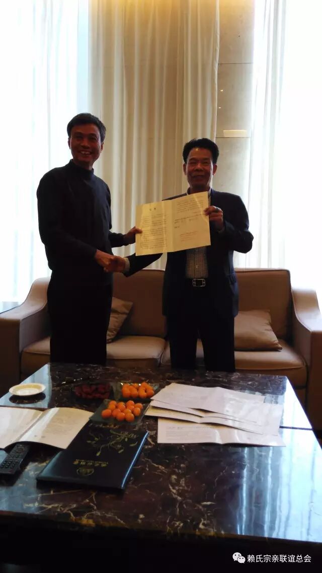 当天下午,松谷、卫东两位会长不辞疲劳,又迅即到广东河源汇源集团会见赖运宏,赖波涛两位宗贤。气氛祥和热烈,波涛宗亲欣然在认捐500万元协议书上确认余款300万元年底到账。赖运宏及赖华两位宗贤更是爱族如家,在认捐的500万元的基础上,再追加500万元,即每人为古赖国文化园捐款1000万元!