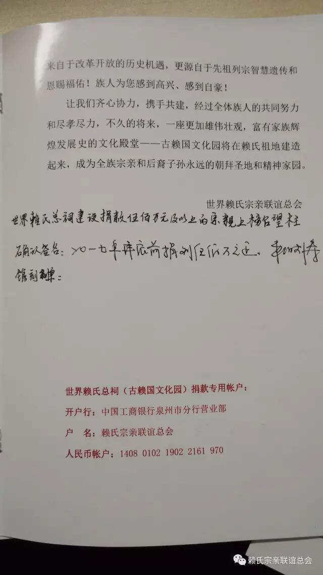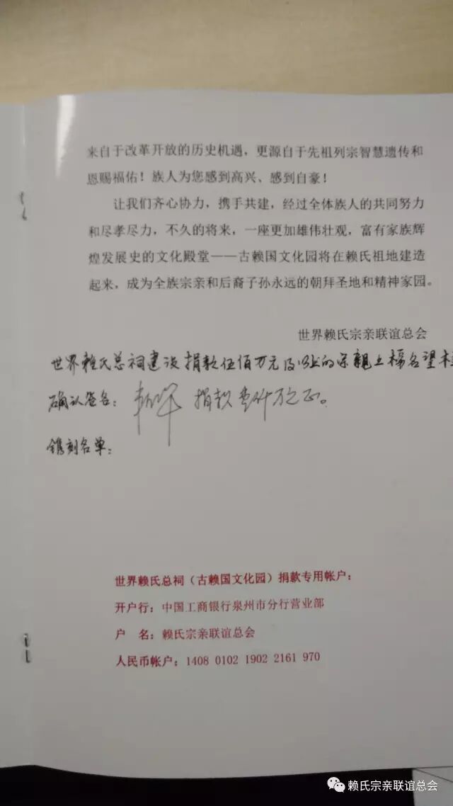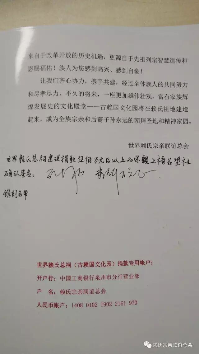 每笔捐款,践行的是孝道之心,凝聚的是家族团结兴旺之心,体现的是对先祖列宗虔诚之心。财富是属性是社会的,赚钱靠能力,机会,而化钱确需要大智慧。对佛的供养,对祖宗仁孝,对社会的回馈都是种广大福田。爱出者爱返 福往者福来。在此祝愿四位宗长康健吉祥,财源滾滾,基业常青!祝愿所有为赖氏事业无私奉献的宗亲心想事成,万事如意!
