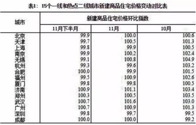 为深入反映房地产市场近期变化,,又对其中15个一线和热点二线城市11月下半月房价变动情况进行了统计。