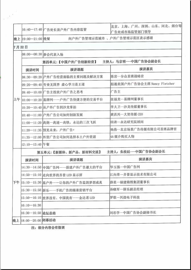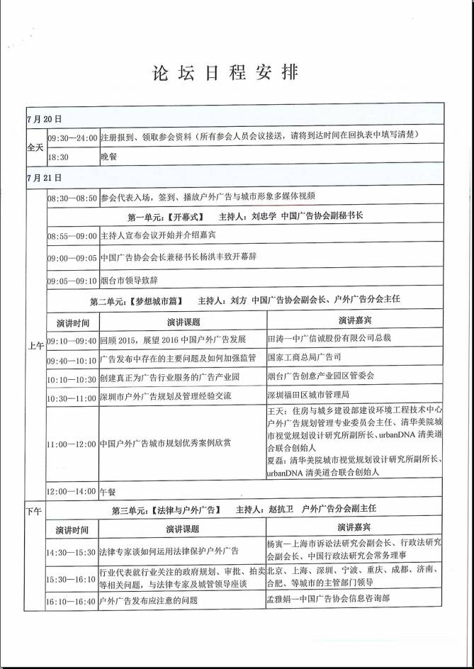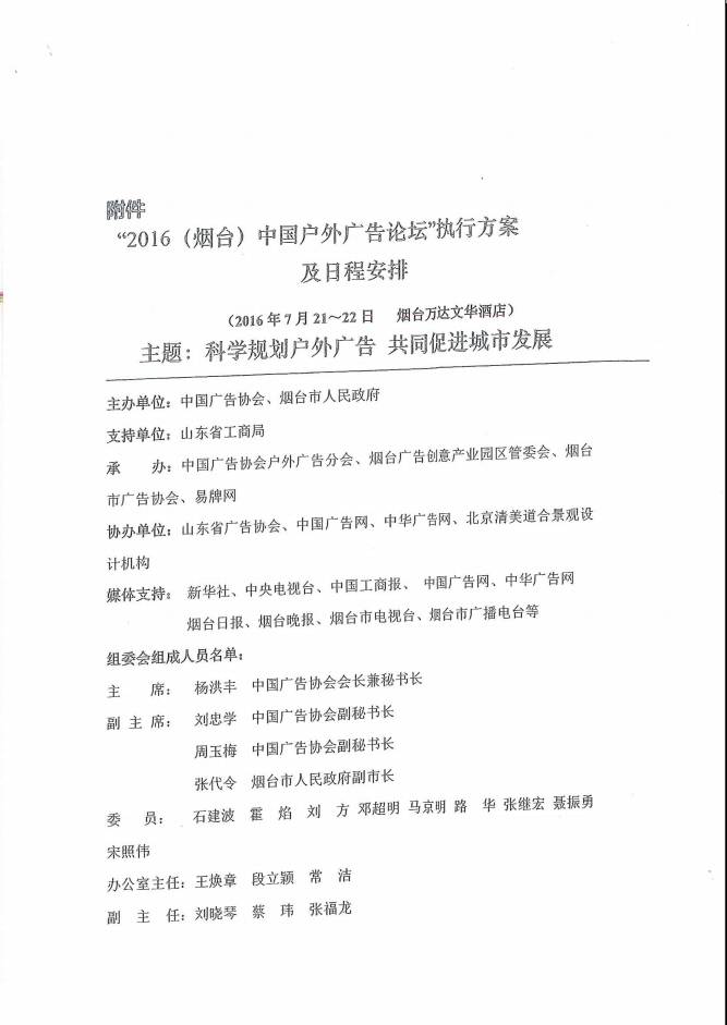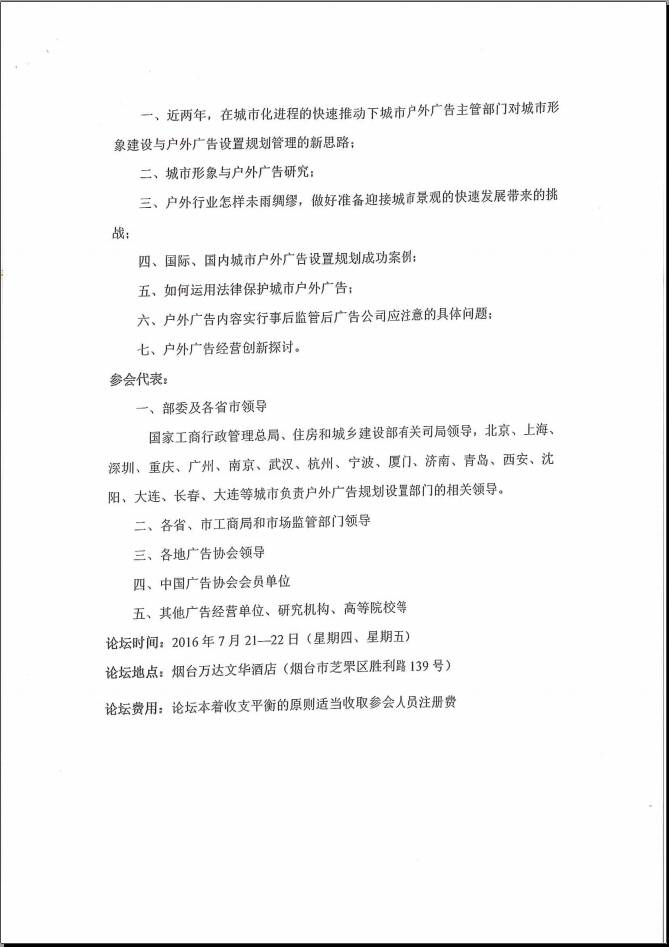 中国广告协会定于2016年7月21-22日(周四、周五)在山东省烟台市举办“2016(烟台)中国户外广告论坛”。