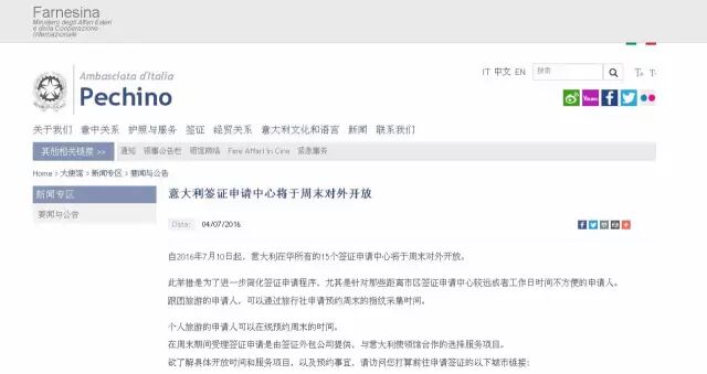 继法国签证中心表示周六开放申请后! ,自7月10日起,意大利在华所有的15个签证申请中心将于周末对外开放,受理时间从10时到14时。