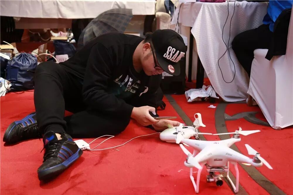 物料间内,试驾工程师俯卧在地上进行航拍器测试,据他介绍,这将是首次利用航拍器在本品试驾上进行拍摄,为了配合三地集赞活动,特别想出这个办法,力求最大程度地展现广州的人文风采,给广州拉票。
