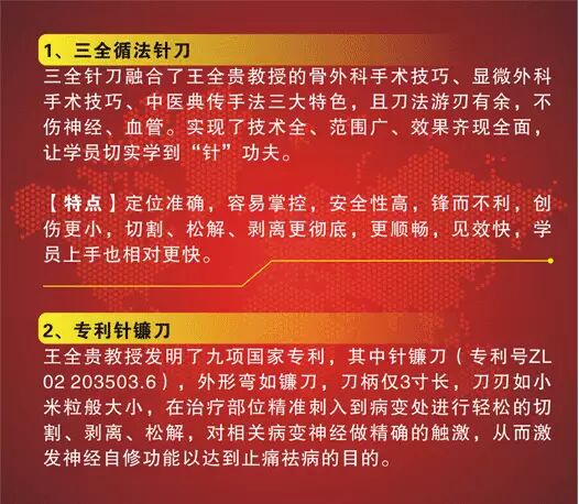 2、“专利针镰刀”与“三全循法针刀”微创技术高级研修班6800/人。其中包括“专利针镰刀”技术转让费、学费、资料费、学习期间临床实践、证书费等,食宿统一安排,费用自理。