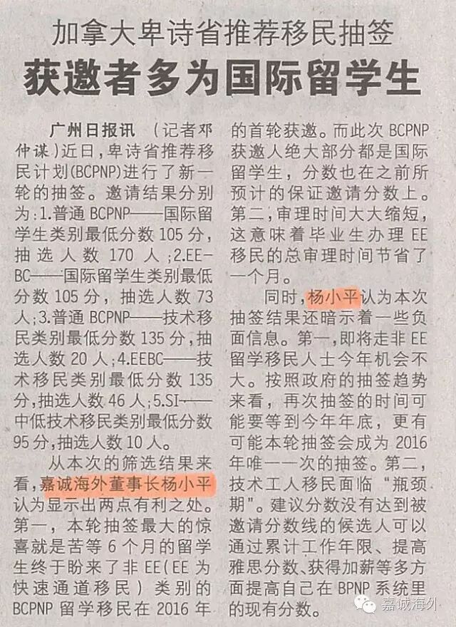 近日,卑诗省推荐移民计划(BCPNP)进行了新一轮的抽签。邀请结果分别为:1.普通BCPNP——国际留学生类别最低分数105分,抽选人数170人;2.EEBC——国际留学生类别最低分数105分,抽选人数73人;3.普通BCPNP——技术移民类别最低分数135分,抽选人数20人;4.EEBC——技术移民类别最低分数135分,抽选人数46人;5.SI——中低技术移民类别最低分数95分,抽选人数10人。从本次的筛选结果来看,嘉诚海外董事长杨小平认为显示出两点有利之处。第一,本轮抽签最大的惊喜就是苦等6个月的留学生终于盼来了非EE(EE为快速通道移民)类别的BCPNP留学移民在2016年的首轮获邀。而此次BCPNP获邀人绝大部分都是国际留学生,分数也在之前所预计的保证邀请分数上。第二,审理时间大大缩短,这意味着毕业生办理EE移民的总审理时间节省了一个月。同时,杨小平认为本次抽签结果还暗示着一些负面信息。第一,即将走非EE留学移民人士今年机会不大。按照政府的抽签趋势来看,再次抽签的时间可能要等到今年年底,更有可能本轮抽签会成为2016年唯一一次的抽签。第二,技术工人移民面临“瓶颈期”。建议分数没有达到被邀请分数线的候选人可以通过累计工作年限、提高雅思分数、获得加薪等多方面提高自己在BPNP系统里的现有分数。