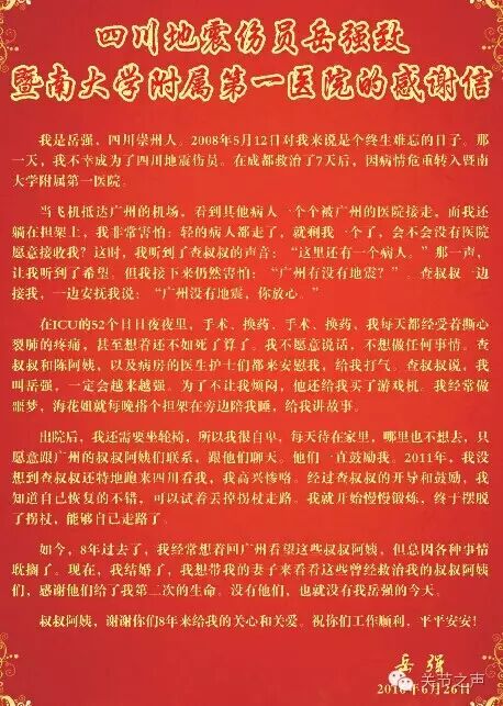 岳强在暨大附一院住院治疗70多天,其中52天是在ICU病区度过的。“你叫岳强,你一定会越来越强”,带着查振刚叔叔的这句话,岳强坐着轮椅回四川继续康复治疗。