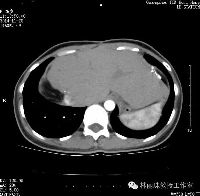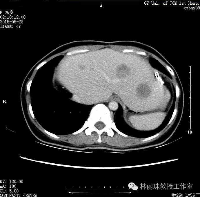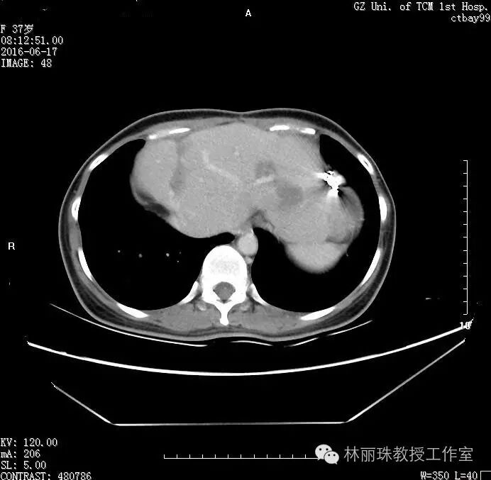 按:晚期ICC缺乏有效治疗手段,大部分患者确诊后多在6-8个月内死亡。本患者发现时已属晚期,外院肝癌术后复发TACE术后,在我院累计行化疗次数达25次之多,期间多次出现病情进展,在化疗的间歇期运用中医药维持治疗取得了很好的疗效。林教授认为,该患者属肝热血瘀范畴,中医治法应以清肝凉血、解毒袪瘀为主,除了在化疗基础上予加用贝伐珠单抗靶向治疗、配合粒子植入术等西医治疗之外,还采用了全程中医药治疗保驾护航。