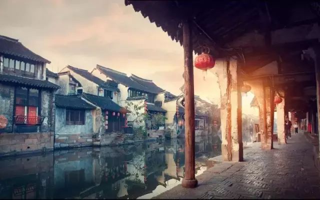 碧水萦绕着白墙,红花攀附于黛瓦,蜿蜒曲折的小河在夕阳中浅吟低唱。