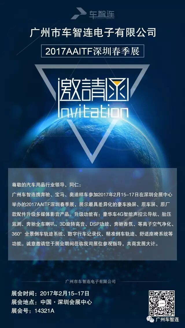尊敬的汽车用品行业领导、同仁:广州车智连携奔驰、宝马、奥迪样车参加2017年2月15-17日在深圳会展中心举办的2017AAITF深圳春季展,展示最具差异化的豪车换屏、原车屏、原厂款配件升级多媒体影音产品。升级功能有:豪华车4G智能声控云导航、胎压监测、奔驰全车喇叭、3D旋转高音、DSP功放、奔驰香氛、等离子空气净化、360°全景倒车轨迹系统、数字行车记录仪、精准倒车轨迹、舒适座椅系统等功能。诚意邀请您于展会期间莅临我司展位参观指导,共商发展大计。