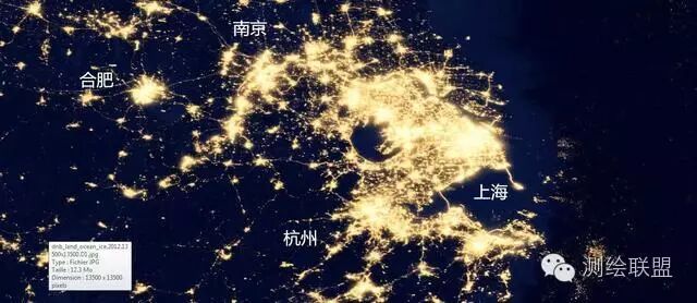 长三角卫星亮度图:从图中能看到上海、杭州、和南京已经连到一块了,而且亮度十足。