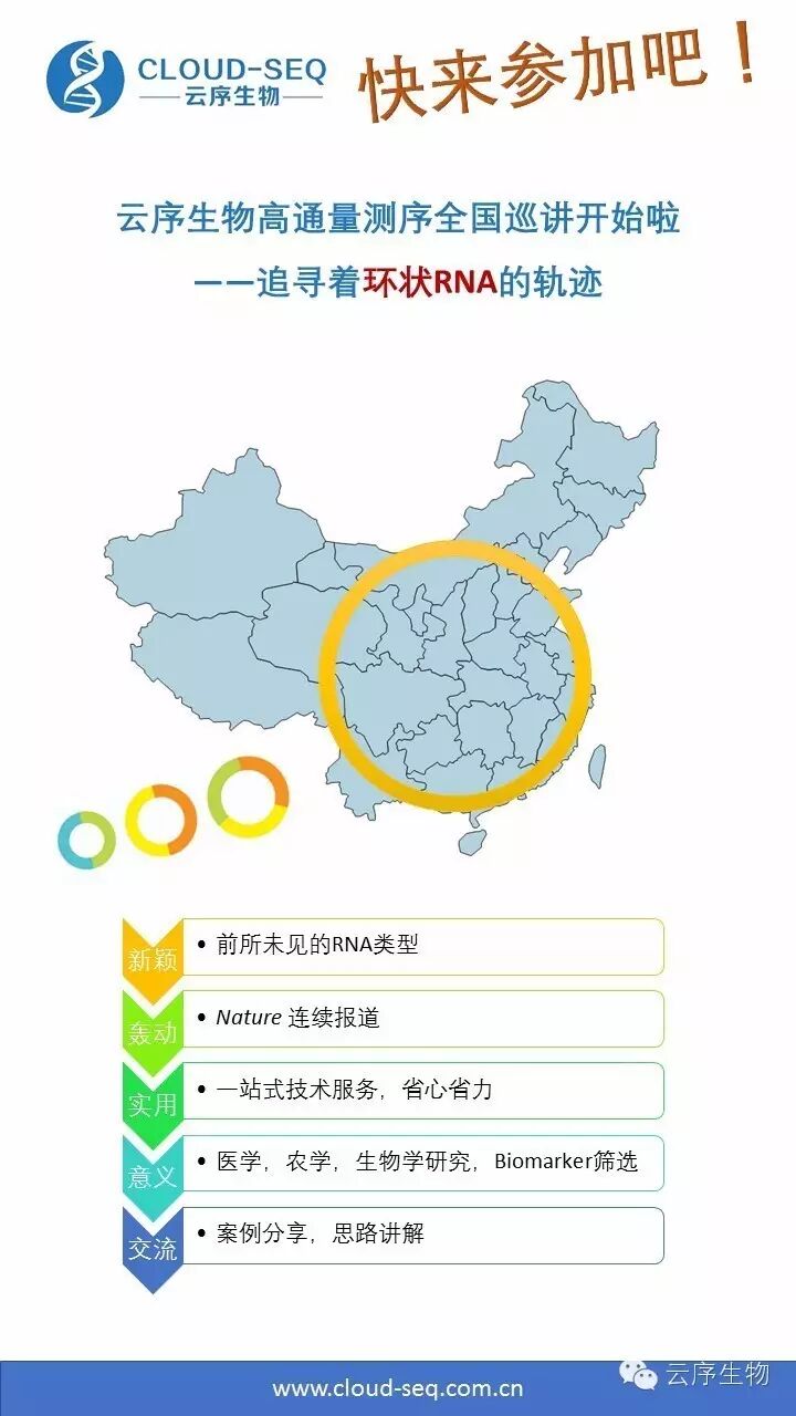 云序生物2016春季全国巡讲开始啦,聚焦高通量测序在医学和农学研究中的完整解决方案!追寻着环状RNA的轨迹,我们将在上海,北京,广州,成都天津,西安,武汉,厦门,南昌等地举办学术讲座。