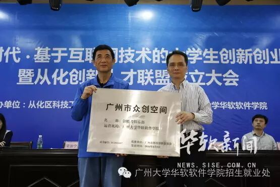 从化高校创新人才联盟成立,大会选举广州大学华软软件学院为联盟首届当值高校,并获颁“从化高校创新人才联盟理事长单位”牌匾。从化区科技工业商务和信息化局副局长董小星(右)向华软学院常务副院长、创新创业学院院长迟云平(左)授牌。
