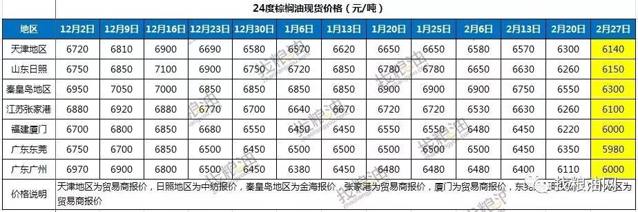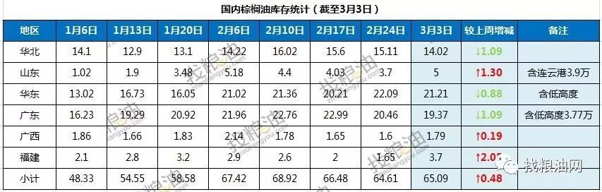 利空因素积累,本月棕榈油现货行情弱势运行。月初,春节过后,国内油脂市场整体需求相对清淡,棕榈油价格振荡下跌。月中下旬,需求端亮点不足,无法对价格形成有力支撑,棕油价格大幅下跌。截至2月28日,国内主要地区棕榈油现货价格:天津6100,张家港6040,广州5950,日照6100元/吨。二、库存情况