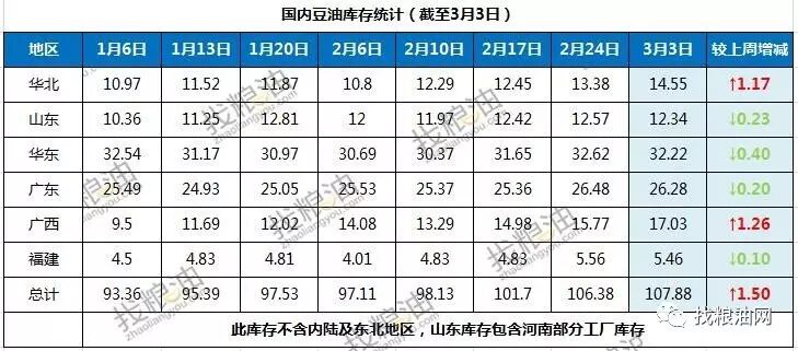 截至3月3日,国内主要地区豆油商业库存在107.88万吨,较上一周上升1.5万吨。国内华北、广西地区油厂库存略有上升,华东等地区库存略有下降。三、压榨情况