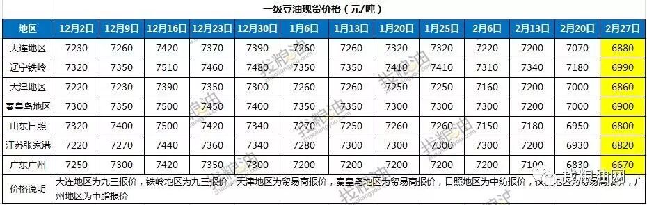 本月豆油价格不断走低。春节过后,需求转淡,南美大豆产量预估上调,豆油期价大幅下行。月中,油厂开机率回升,豆油库存高企。月末,豆油商业库存增至110万吨左右,周环比增加超5%。豆油现货价格跌跌不休。截至2月28日,国内主要地区豆油现货价格:大连6880,天津6840,日照6800,广州6670元/吨。二、库存情况