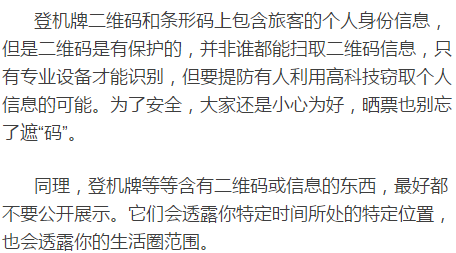 而实际上,朋友圈晒火车票、飞机票时应注意保护票面上的条形码或者二维码,因为这很可能成为泄露个人信息的途径。