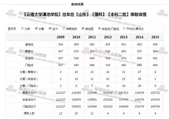 比如,我们在新浪高考志愿通“高校各专业分数线查询”中可以看到,云南大学滇池学院往年在山东一般是是贴二本线进行录取的,二本“贴线”考生报考这样的院校被录取的机会很大。更多院校及往年录取情况可以在新浪高考志愿通(http://zhiyuan.edu.sina.cn/query/)中进行查找。