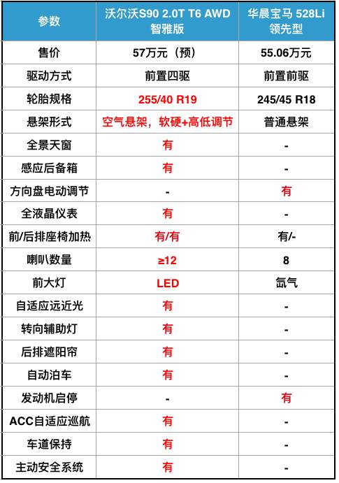 在刚刚过去的6月份,S90的竞争对手中销量最好的是宝马5系,我们就用与S90起步预售价最接近的528Li领先型来跟S90的入门版本做个配置上的对比。