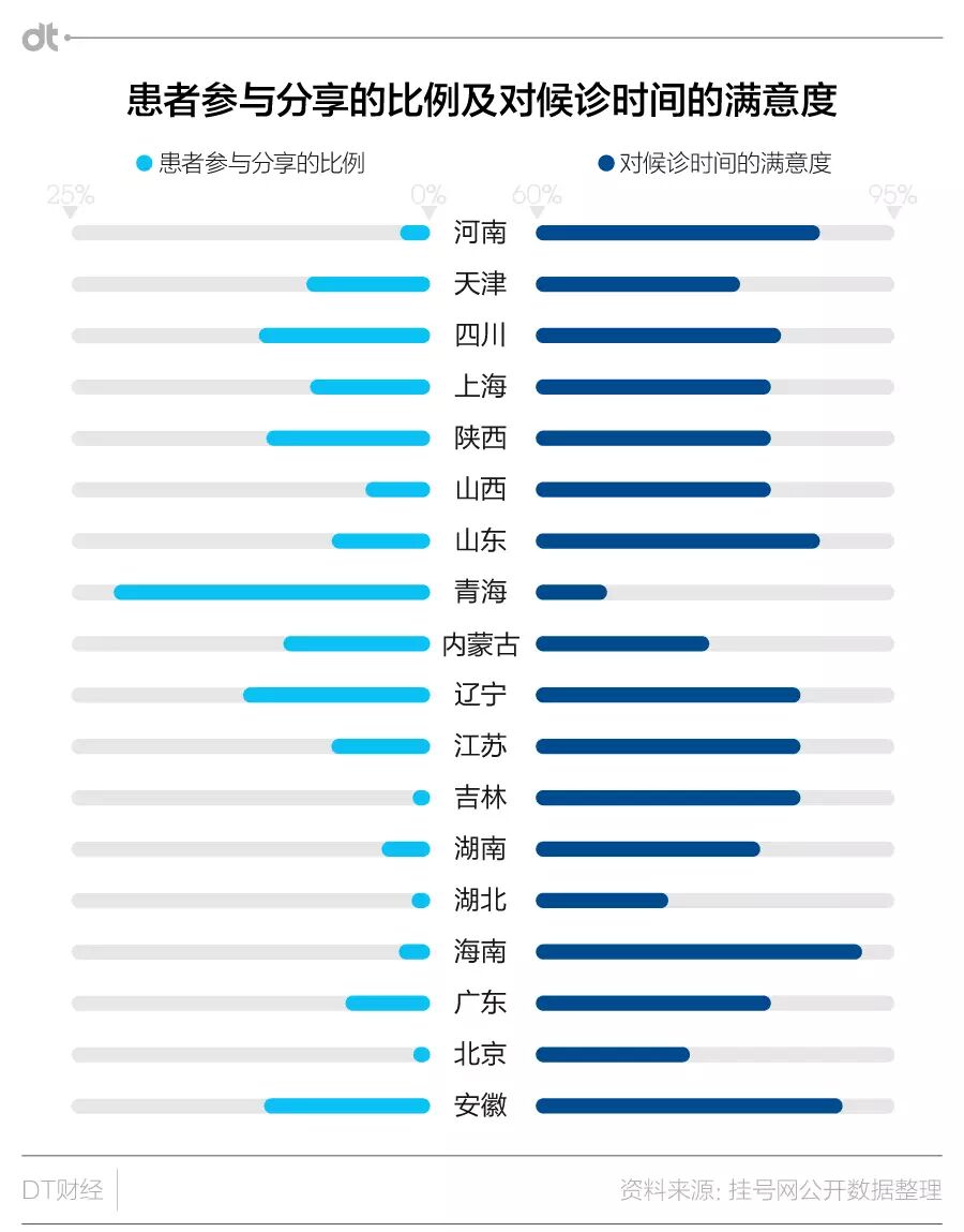 DT君分析了两个数据,一个是大家看完病之后有多少人愿意回到挂号网进行分享与评价,这意味患者对网上挂号的参与性强不强,另一个则是对候诊时间的满意度如何。