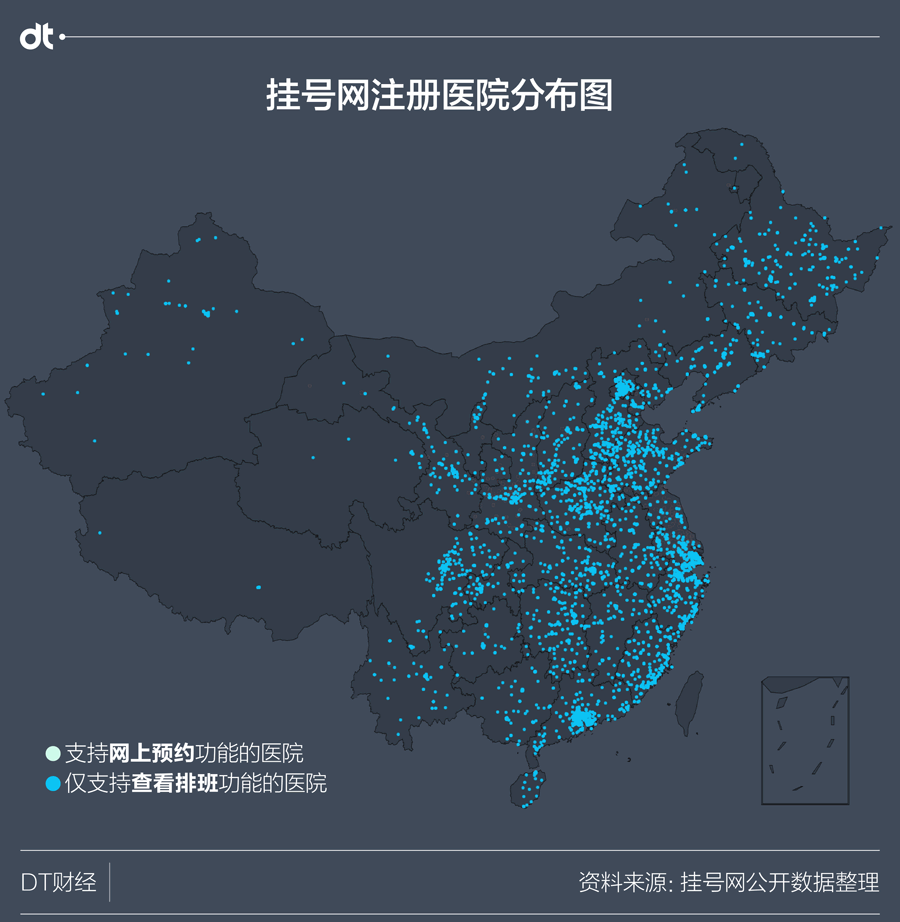 也就是说,虽然挂号网“坐拥”7100多家医院,但DT君通过数据发现,其中有5000多家仅支持“查看排班”的功能,真正能在挂号网上挂号的只有1336家。