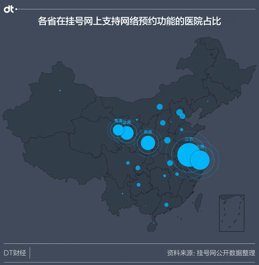 DT君整理了各省市每家医院在挂号网上6月底的累计挂号人数情况,制作了下面这张动图,每个蓝色的点,都表示在某个省的一家特定医院的累计挂号人数。