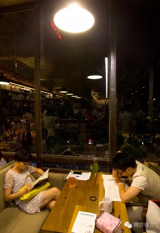 △24小时不打烊的书店为喜欢夜读的市民提供了一个“乐园”。有人说:“深夜为读书人点燃一盏灯,一座城市就被点亮了。”——24小时书店就是城市的这盏灯。城市的午夜,或许你正结束一天的奔波,沿着霓虹灯闪烁的街道漫步回家;又或许你正准备前往酒吧放松自己;其实还有一个不寻常的地点可以度过你的夜生活——24小时书店。深夜,我们书店见。△在繁华的体育东路上,市民可以在书店觅得心灵的宁静。凌晨两点十五分,阿峰和几个同学一起来到位于体育东路的广州第一家24小时营业书店——1200bookshop,在斑驳树影的映衬下,书店灯光显得特别温暖。爬了一段充满文艺气息的木梯后,150平方米的书店仿若一个温馨的书友之家——书柜、免费阅读区、沙发休闲区、洗手间甚至吧台。阿峰挑了本《行走台湾》便沉浸其中。
