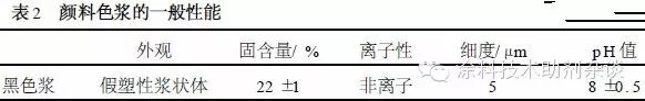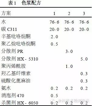 以黑色浆制备工艺为例,配方见表1 。称取40g 蒸馏水,2g 辛基吡咯烷酮,搅匀,加入20g C311 ,使碳黑完全润湿, 加0.2g 杀菌剂HX - 6050 ,0.5g 消泡剂470 ,36.6g 蒸馏水,0.2g氨水,预分散30min ,在砂磨机中研磨4h ,加入0.5g 聚乙烯吡咯烷酮,调配搅拌30min ,即为色浆成品。