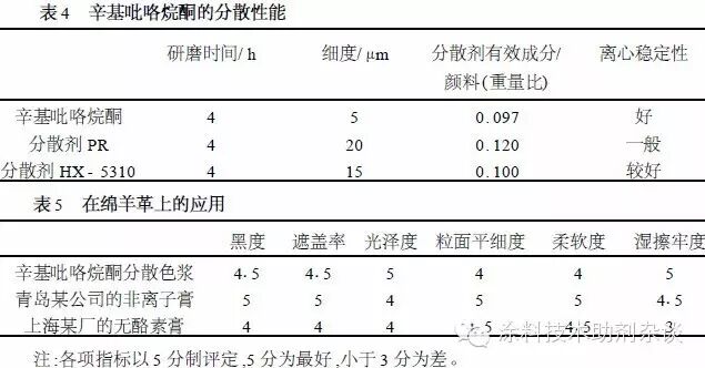 分散剂PR 是萘磺酸甲醛缩合物钠盐,普遍用于电缆线黑色浆中碳黑的分散。分散剂HX - 5310 是高分子聚羧酸共聚物胺盐,在涂料色浆中广泛用于碳黑、酞青蓝等颜料的分散。辛基吡咯烷酮的分散性能见表4 。由表4 可知,辛基吡咯烷酮对碳黑有良好的分散性。这是因为颜料粒子吸附辛基吡咯烷酮,亲水基朝外形成单分子吸附层后,亲水基与辛基吡咯烷酮的亲水基相吸附形成双吸附层,吸附层酮基的极性相互排斥,使颜料分散稳定。烷基吡咯烷酮碳原子数超过16 ,则不溶于水,不宜在水性色浆中使用,烷基链碳数小于4 , 则亲油性不强,而碳黑及有机颜料是亲油性颜料,其吸附性不强,分散效果不好。因此,宜用C8 和C12的烷基吡咯烷酮作分散剂。对颜料质量比的用量最好用10 %~30 %。用量少于1 % , 对颜料吸附的辛基吡咯烷酮只能形成单分子吸附层,其极性排斥不充分,不能获得稳定分散体。用量大于50 % ,因辛基吡咯烷酮HLB 值为6 ,使颜料粒子拒水而难以在水中分散。聚乙烯吡咯烷酮能将已分散的颜料包覆在内,使被分散的颜料粒子的空间位阻进一步加大,颜料粒子更不易二次聚集,起到保护颜料胶体稳定性的作用。但聚乙烯吡咯烷酮的成膜性硬而脆,应选用聚合度低的型号,且用量在0. 1 %~3 %为佳,否则对皮革手感有影响。聚丙烯酰胺也具有很好的增稠、保护胶体的稳定性,但其在酸或碱性条件下易发生水解[10 ] 。羟乙基纤维素能与水形成氢键,吸水缔合增稠幅度大,但贮存时部分缔合水会重新析出,色浆表面易形成水液,且耐腐败性不好。