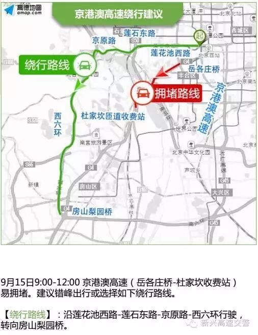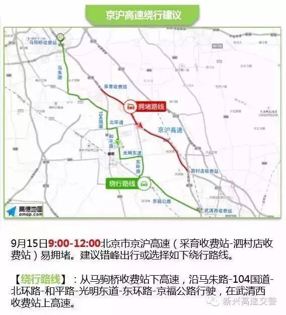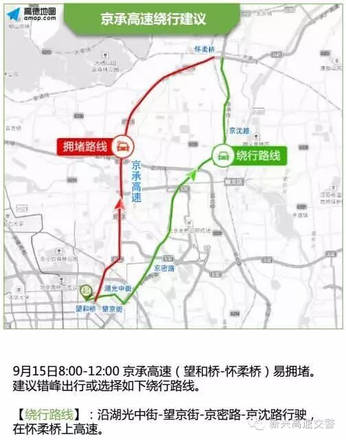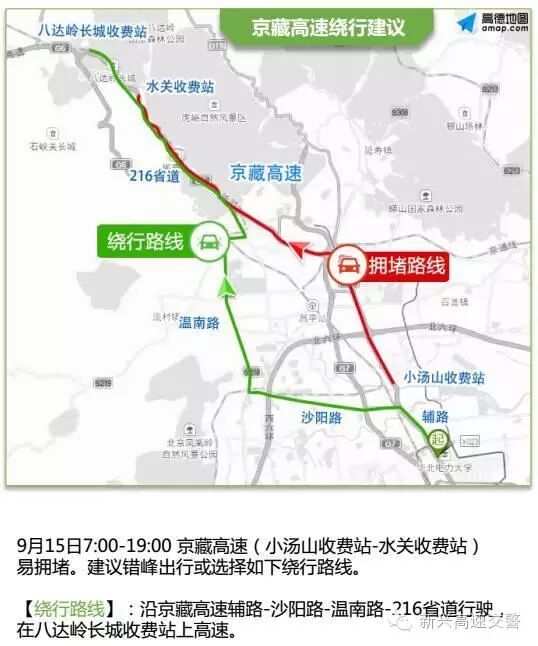 9月15日上午京津冀区域部分高速路段易出现严重拥堵,尤其是北京周边出城方向高速,7:00-19:00京藏高速、8:00-12:00京承高速拥堵较为突出,所以有出游计划的朋友一定要提前计划~