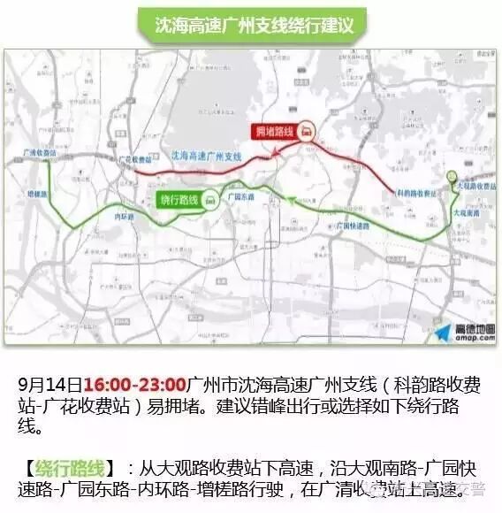 9月14日下午珠三角区域部分高速路段易出现拥堵现象,尤其是广州周边出城方向高速,13:00-23:00莞佛高速、 16:00-23:00沈海高速广州支线拥堵较为突出。