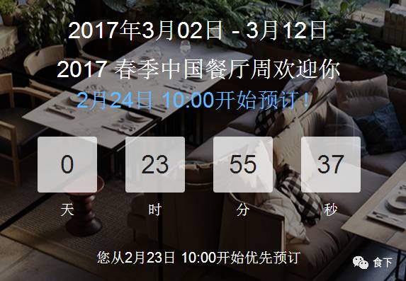 中国餐厅周让您以超值价格在顶级餐厅享用顶级精致美食,活动自2017年3月2日到3月12日。老用户明天起开始优先选择。今年餐厅周活动只在北京、上海、广州、深圳、成都、苏州、杭州、重庆这几个城市举行。可参见我之前写过关于餐厅周的品鉴:【秋季大赏】2016中国餐厅周8月25日10:00开始预订。