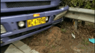 车祸现场,货车向护栏方向倾斜,左侧车轮陷入泥土不能动弹,车辆挡风玻璃破了一个洞。而被追尾的车辆在事故发生后,司机认为属轻微事故,自行离开现场。