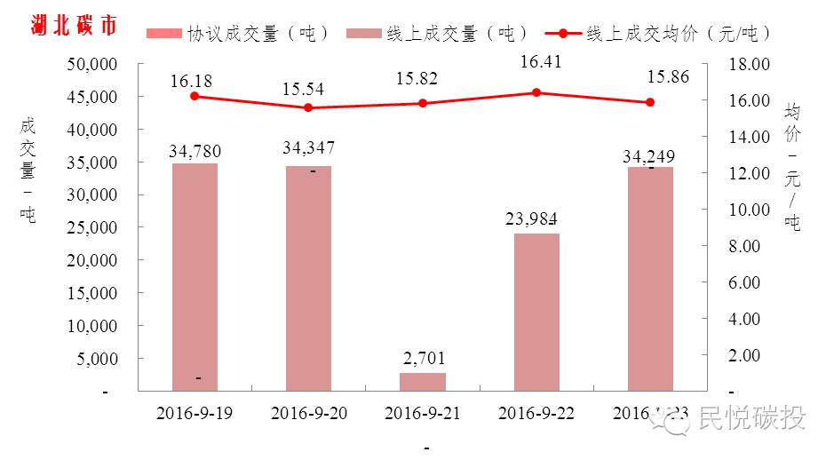 本周湖北碳市HBEA周成交量130,061吨,周成交额207.61万元,周成交量和成交额分别环比上涨144.78%和151.71%。本周配额线上成交均价15.96元/吨。