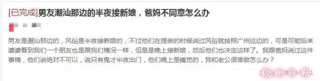 图片文字:男友是潮汕那边的,风俗是半夜接新娘的,不过他们在提亲的时候就说过风俗就按照广州这边的,可是可能后来婆婆看到我们一个朋友也是跟我们情况一样,但是是晚上接新娘,然后他们也决定这样了。我跟爸妈说过这件事情,他们说绝对不可以,说只有鬼才半夜出门,他们晚上是睡觉的,我和老公很难做怎么办?