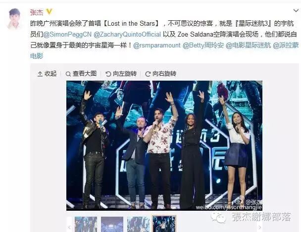 wuli杰哥不仅在我想世界巡演广州站现场首唱了科幻大片《星际迷航3:超越星辰》中国主题曲《Lost in the Stars》,更盛情邀请到电影三大主演SimonPeggCN、ZacharyQuintoOfficial Zoe Saldana惊喜空降。肿么样,si不si赶脚自己的脑洞已经跟不上杰哥制造惊喜的步伐