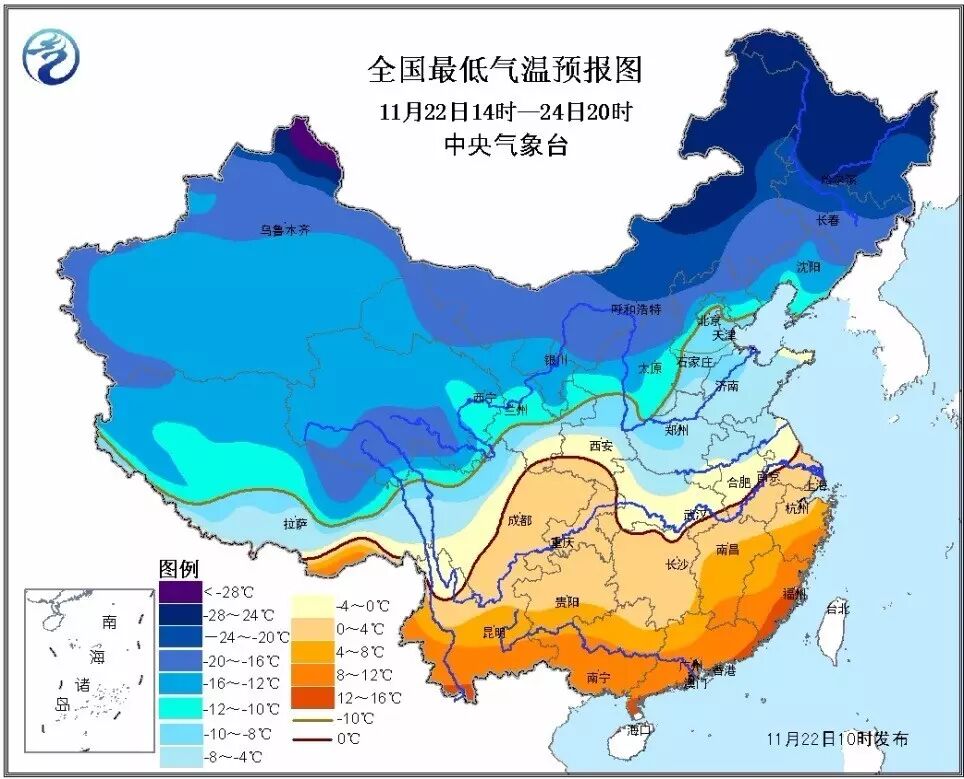 据报道,受寒潮影响,22日至24日,我国黄淮以南的大部地区将继续出现大范围大风降温天气,江淮及以南平均气温将普遍下降6~10℃。其中,广东中北部等地气温将下降12~14℃,并伴有4~6级偏北风,东部和南部海区风力有7~8级,阵风9~10级。