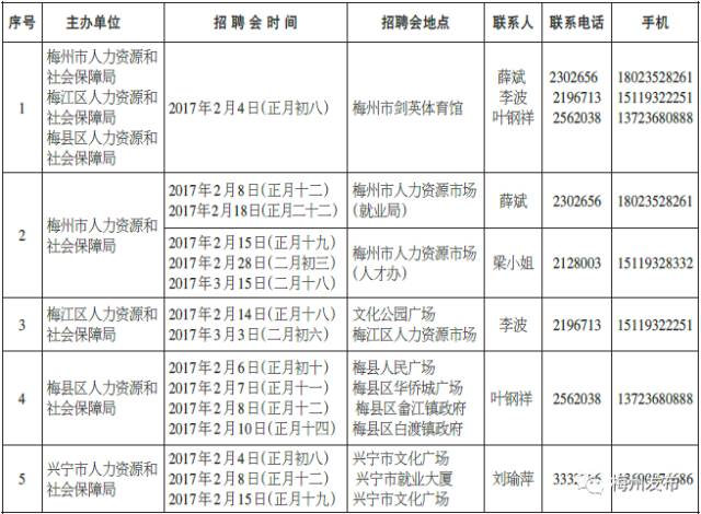 同时为加大广州—梅州人才劳务对接帮扶力度,特邀请广州市人社部门选取45家以上优质企业在我市举办2场招聘会,其中:2月14日在梅州市文化公园、2月15日在兴宁市文化广场。欢迎用人单位和广大求职人员踊跃参加。系列招聘活动的时间地点可在市人力资源信息网(网址:http://www.gdmz.lm.gov.cn)查询。