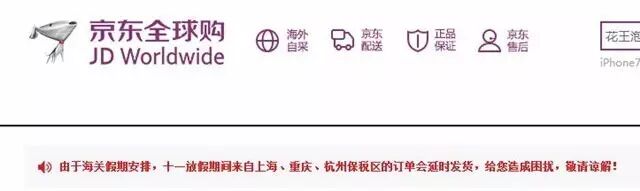 京东全球购则采取与上述两家平台不同的公告方式,在商品介绍页面的左上角用红色加粗字体发布声明,称“ 由于海关假期安排,十一放假期间来自上海、重庆、杭州保税区的订单会延时发货,给您造成困扰,敬请谅解!”,并没有刻意区分自营或是第三方卖家。