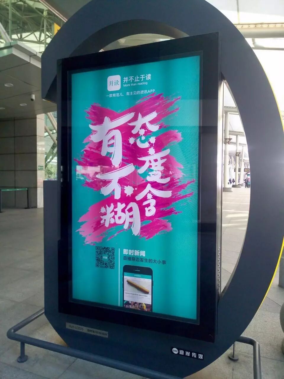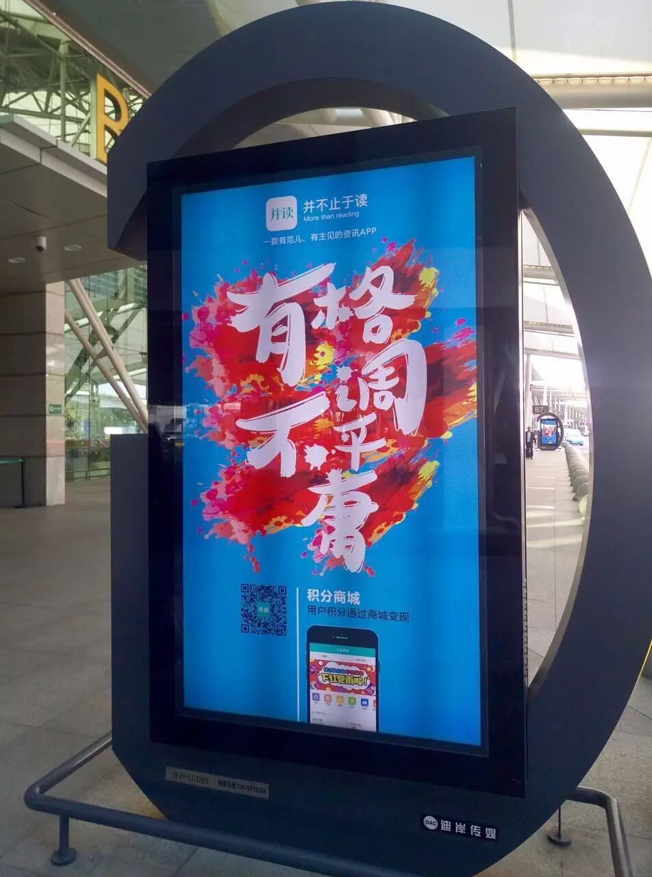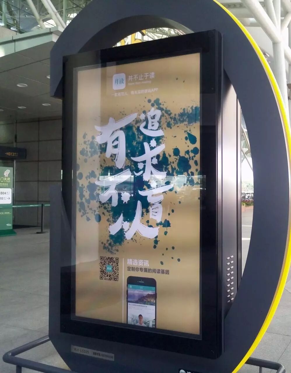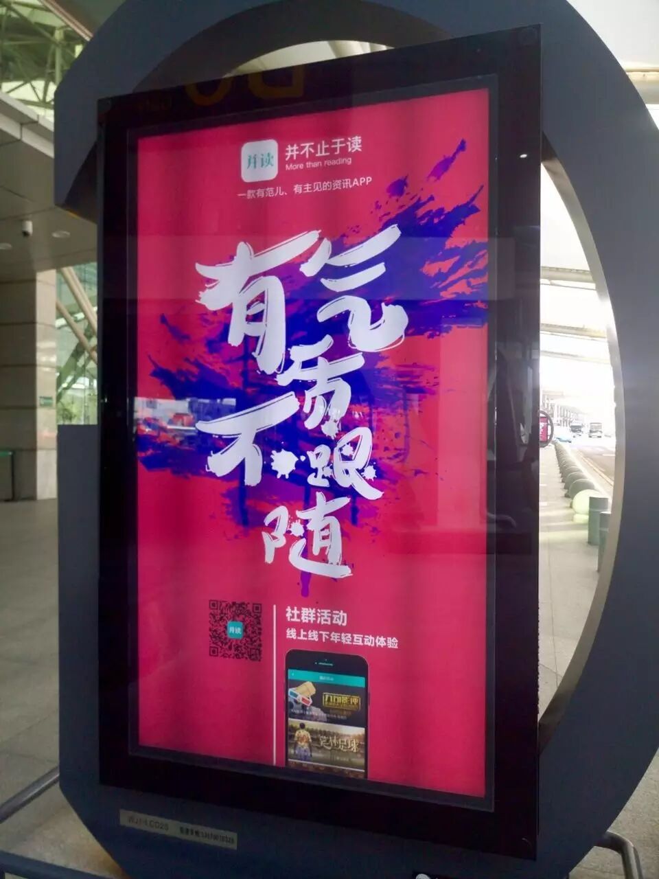 据说这几天出入广州白云国际机场的同学们,已经被并读APP三十二块360度无死角的灯箱广告唤醒了。