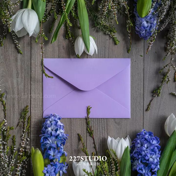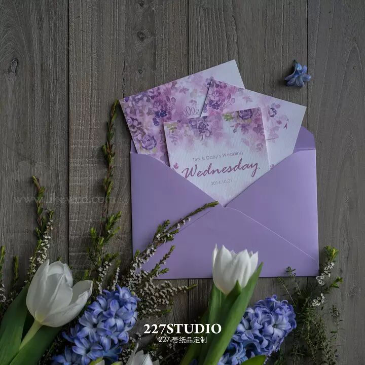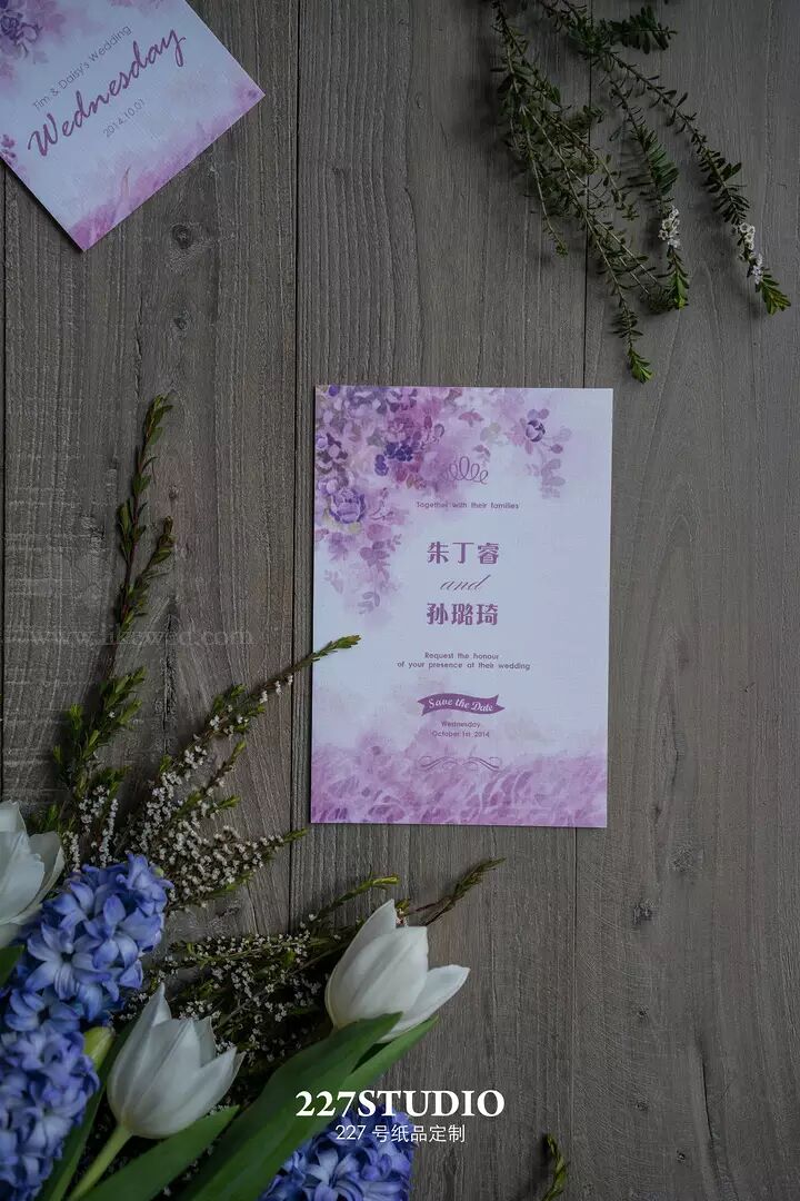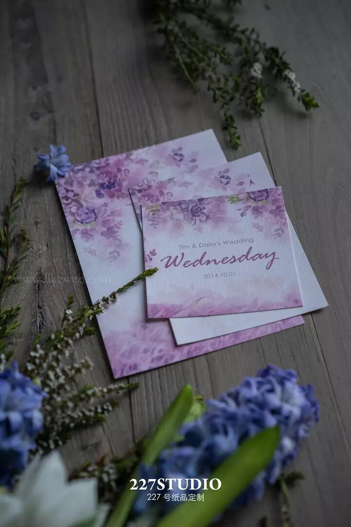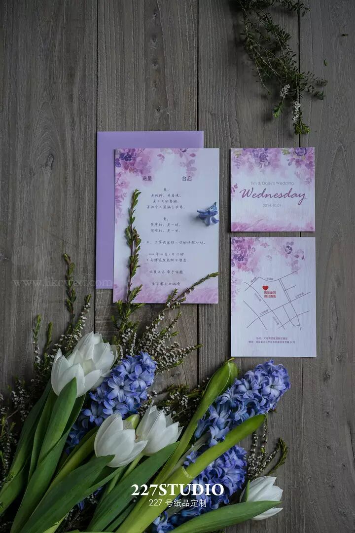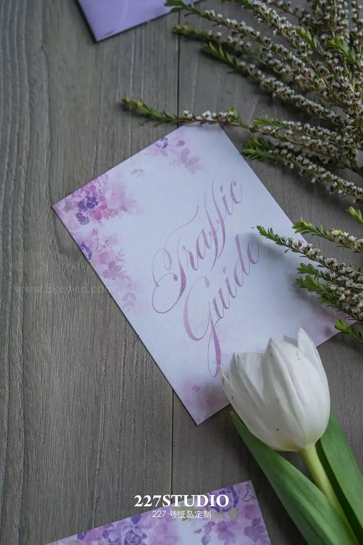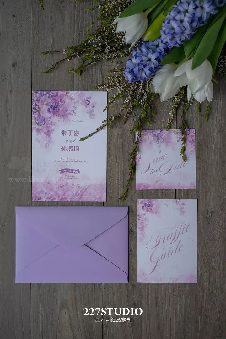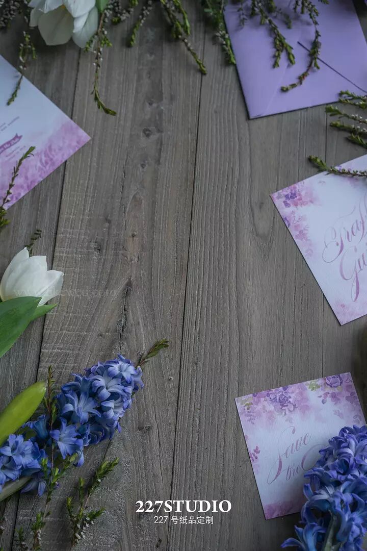 紫色水彩请柬,一套请柬包含一张双面印刷邀请卡,一张地图卡,一张日期卡以及一个信封。