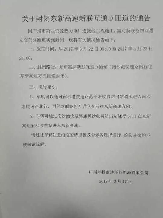 【南沙港快速路(南行)新联立交D匝道封闭一个月】为配合广州市第四资源热力电厂连接线施工,今天(3/22)起,(南行,往南沙方向)新联立交转往东新高速的匝道交通封闭,请途经驾驶人士提早在庙贝沙出口离开,绕行S111省道,在五沙收费站进入东新高速公路通行。封闭施工期持续一个月。