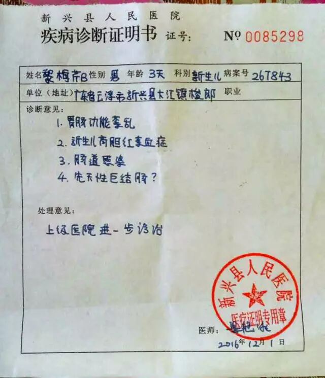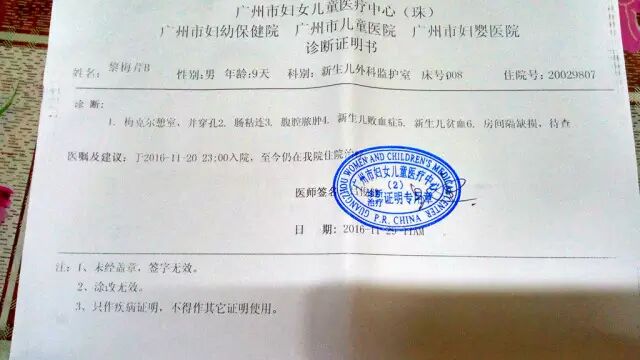 可就在上个月,即11月11日,小儿子的降生在这个家可以说得上是锦上添花。谁料,儿子出生后发现腹部肿胀,在县人民医院儿科住院一周后,医院建议转到广州妇女儿童医疗中心。广州妇女儿童医疗中心诊断儿子的病情为:1梅克尔憩室,并穿孔,2肠粘连,3腹腔脓肿,4新生儿败血症,5新生儿贫血,6房间隔缺损。这对于我们这个本不富裕的家庭来说无疑是一个晴天避雷!